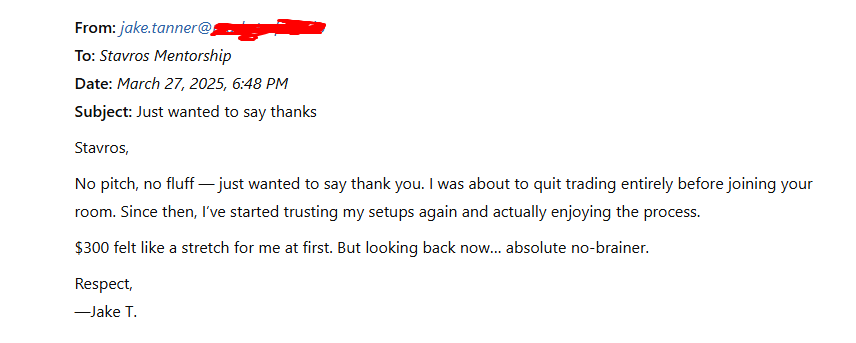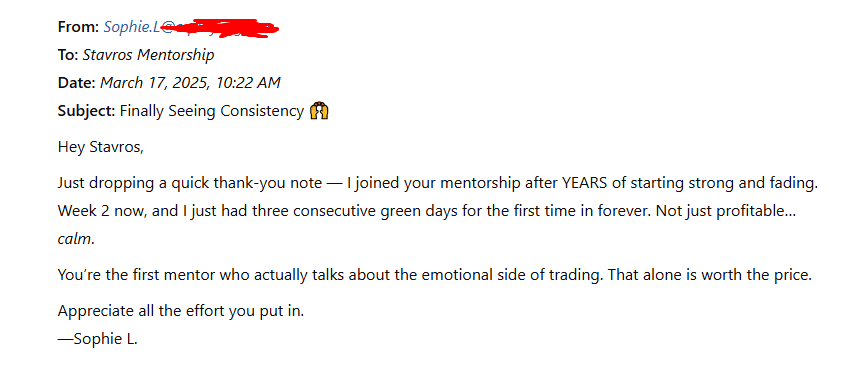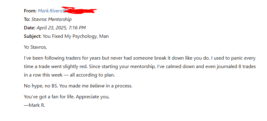 💬 “I didn’t realize how emotional my trading was until this mentorship. Now I wait for my edge, no FOMO, no chasing. Game changer.”