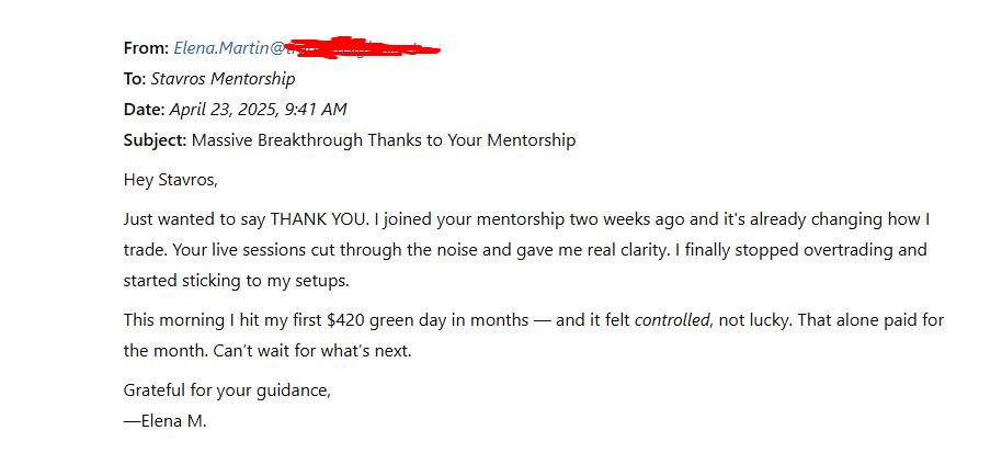 💬 “Before joining this mentorship, I was overtrading and emotionally wrecked. Now I stick to my setup, and last month I hit my first 4-figure week.”